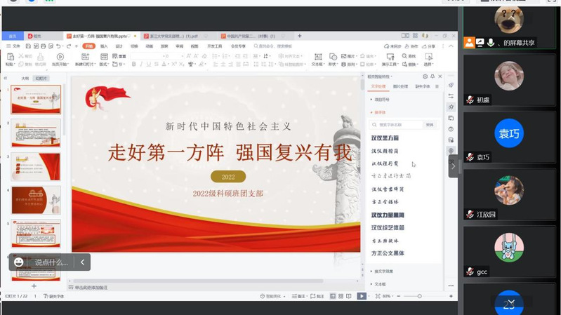 此外,浙大四院研究生团总支整体部署,组织201班团支部、研究生211班团支部、研究生213班团支部、22级博士班团支部、22级科硕班团支部、22级专硕1班团支部、22级专硕2班团支部等支部分别召开10余场“砥砺奋进守初心,青春献礼二十大”主题学习交流会,同学们认真领悟党的二十大提出的新思想新论断、作出的新部署新要求,结合自身临床、科研实际互相交流学习体会,制定贯彻落实的具体举措。